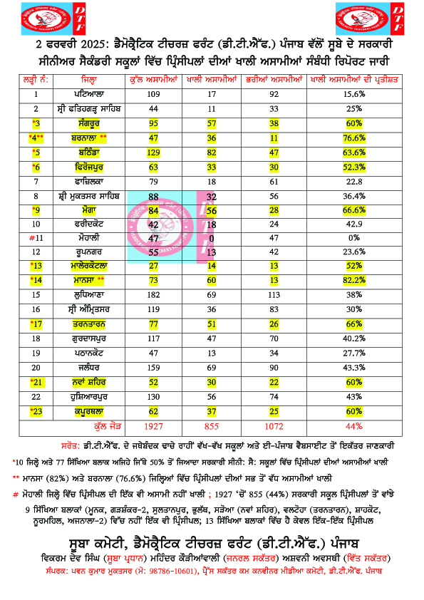 👉 ਡੀ.ਟੀ.ਐੱਫ. ਵੱਲੋਂ ਸਰਕਾਰੀ ਸਕੂਲਾਂ ਵਿੱਚ ਪ੍ਰਿੰਸੀਪਲਾਂ ਦੀਆਂ ਖਾਲੀ ਪੋਸਟਾਂ ਦੀ ਰਿਪੋਰਟ ਜਾਰੀ