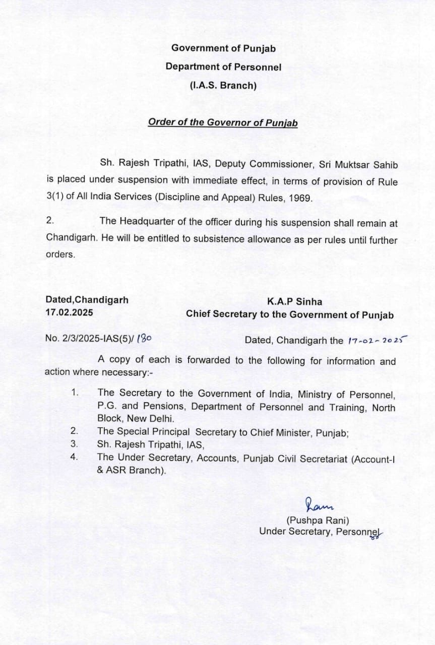 ਪੰਜਾਬ ਵਿੱਚ ਭ੍ਰਿਸ਼ਟ ਅਧਿਕਾਰੀਆਂ ਵਿਰੁੱਧ ਵੱਡੀ ਕਾਰਵਾਈ ਕਰਦਿਆਂ ਮੁੱਖ ਮੰਤਰੀ ਭਗਵੰਤ ਸਿੰਘ ਮਾਨ ਦੀ ਅਗਵਾਈ ਹੇਠ ਪੰਜਾਬ ਸਰਕਾਰ ਨੇ ਵੱਢੀਖੋਰੀ ਦੀਆਂ ਸ਼ਿਕਾਇਤਾਂ ਮਿਲਣ ਮਗਰੋਂ ਸ੍ਰੀ ਮੁਕਤਸਰ ਸਾਹਿਬ ਦੇ ਡਿਪਟੀ ਕਮਿਸ਼ਨਰ ਨੂੰ ਅਹੁਦੇ ਤੋਂ ਹਟਾ ਦਿੱਤਾ ਅਤੇ ਮੁਅੱਤਲ ਕਰ ਦਿੱਤਾ ਹੈ।