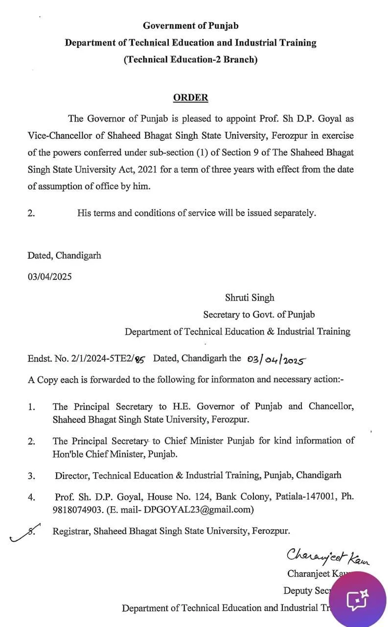 ਪੰਜਾਬ ਦੇ ਰਾਜਪਾਲ ਗੁਲਾਬ ਚੰਦ ਕਟਾਰੀਆ ਵੱਲੋਂ ਪ੍ਰੋਫੈਸਰ ਡੀਪੀ ਗੋਇਲ ਨੂੰ ਸ਼ਹੀਦ ਭਗਤ ਸਿੰਘ ਸਟੇਟ ਯੂਨੀਵਰਸਿਟੀ ਫਿਰੋਜ਼ਪੁਰ ਦਾ ਵਾਈਸ ਚਾਂਸਲਰ ਨਿਯੁਕਤ ਕੀਤਾ ਗਿਆ ਹੈ।