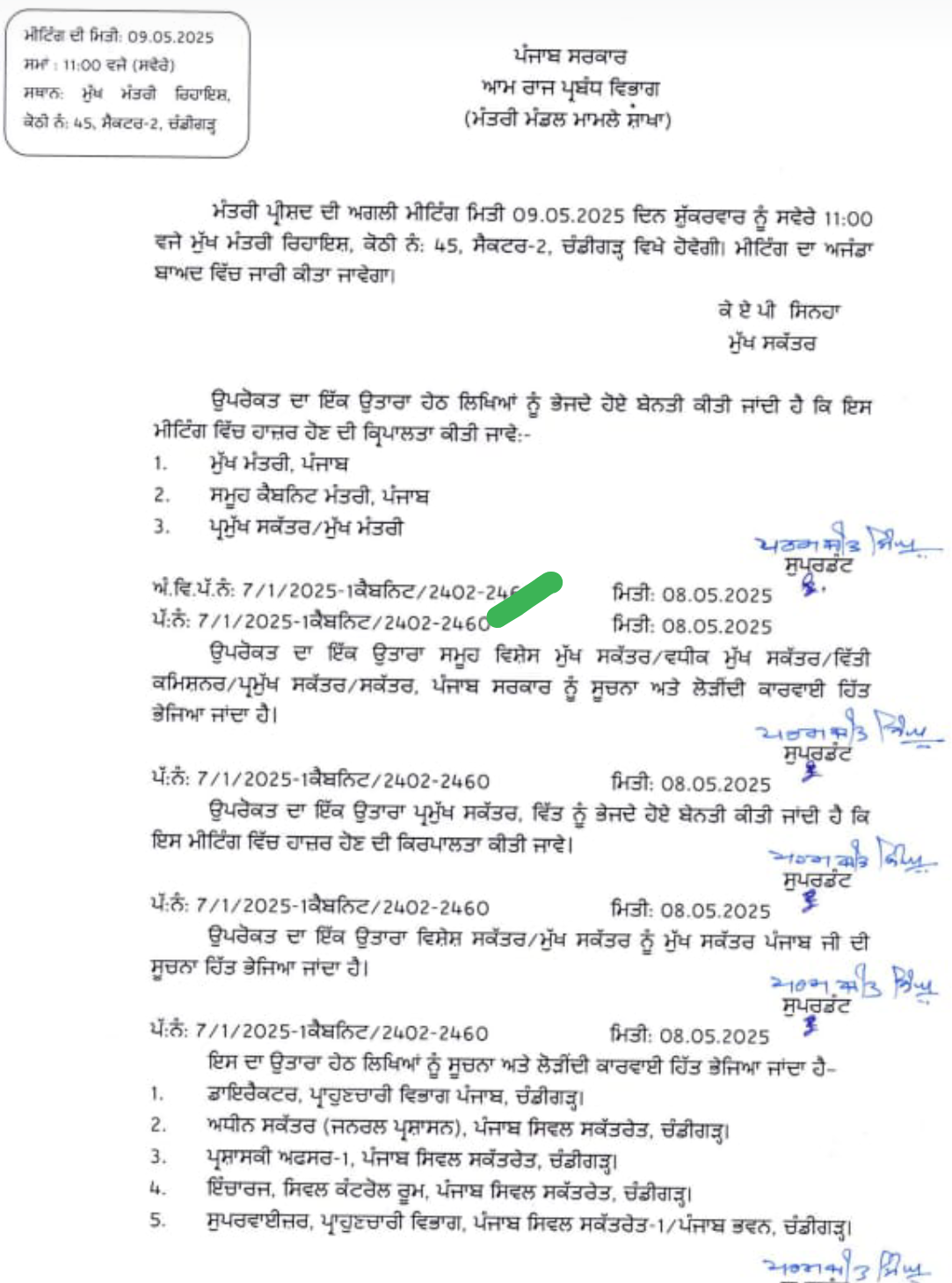ਪੰਜਾਬ ਮੰਤਰੀ ਮੰਡਲ ਦੀ ਮੀਟਿੰਗ ਭਲਕੇ 9 ਮਈ ਨੂੰ ਮੁੱਖ ਮੰਤਰੀ ਦੀ ਰਿਹਾਇਸ਼ ਉੱਤੇ ਹੋਵੇਗੀ। ਮੀਟਿੰਗ ਵਿੱਚ ਪੰਜਾਬ ਦੇ ਮੌਜੂਦਾ ਮਾਹੌਲ ਬਾਰੇ ਚਰਚਾ ਕੀਤੀ ਜਾਣ ਦੀ ਸੰਭਾਵਨਾ ਹੈ।। ਹਰਿਆਣਾ ਨਾਲ ਪਾਣੀਆਂ ਦਾ ਜੋ ਵਿਵਾਦ ਚੱਲਦਾ ਹੈ ਉਸ ਬਾਰੇ ਵੀ ਮੀਟਿੰਗ ਵਿੱਚ ਏਜੰਡਾ ਰੱਖਿਆ ਜਾ ਸਕਦਾ ਹੈ।