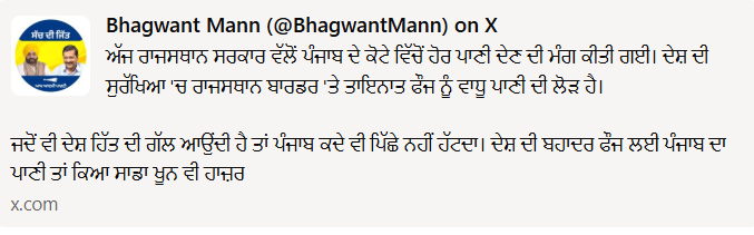 ਮੁੱਖ ਮੰਤਰੀ ਨੇ ਆਪਣੇ ਐਕਸ ਅਕਾਉਂਟ ਉਤੇ ਜਾਣਕਾਰੀ ਦਿੱਤੀ ਹੈ ਕਿ ਅੱਜ ਰਾਜਸਥਾਨ ਸਰਕਾਰ ਵੱਲੋਂ ਪੰਜਾਬ ਦੇ ਕੋਟੇ ਵਿੱਚੋਂ ਹੋਰ ਪਾਣੀ ਦੇਣ ਦੀ ਮੰਗ ਕੀਤੀ ਗਈ। ਦੇਸ਼ ਦੀ ਸੁਰੱਖਿਆ ‘ਚ ਰਾਜਸਥਾਨ ਬਾਰਡਰ ‘ਤੇ ਤਾਇਨਾਤ ਫੌਜ ਨੂੰ ਵਾਧੂ ਪਾਣੀ ਦੀ ਲੋੜ ਹੈ। ਜਦੋਂ ਵੀ ਦੇਸ਼ ਹਿੱਤ ਦੀ ਗੱਲ ਆਉਂਦੀ ਹੈ ਤਾਂ ਪੰਜਾਬ ਕਦੇ ਵੀ ਪਿੱਛੇ ਨਹੀਂ ਹੱਟਦਾ। ਦੇਸ਼ ਦੀ ਬਹਾਦਰ ਫੌਜ ਲਈ ਪੰਜਾਬ ਦਾ ਪਾਣੀ ਤਾਂ ਕਿਆ ਸਾਡਾ ਖੂਨ ਵੀ ਹਾਜ਼ਰ ਹੈ। ਫੌਜ ਦੇ ਜਵਾਨਾਂ ਦੀ ਜ਼ਰੂਰਤ ਨੂੰ ਧਿਆਨ ਵਿੱਚ ਰੱਖਦੇ ਹੋਏ ਮੈਂ ਰਾਜਸਥਾਨ ਨੂੰ ਵਾਧੂ ਪਾਣੀ ਤੁਰੰਤ ਦੇਣ ਦਾ ਨਿਰਦੇਸ਼ ਦਿੱਤਾ ਹੈ।
